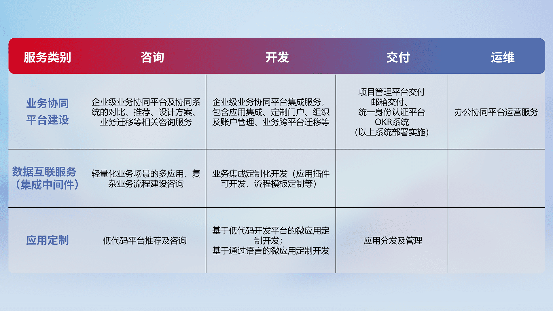 针对钉钉、、企微、、、IDaas等平台级产品提供产品的规划、、方案、、交付、、、定制化开发等服务,,,,实现如统一协同办公、、智能客户服务、、混合会议管理、、、智能数据查询、、等业务场景,,实现数字化转型。。