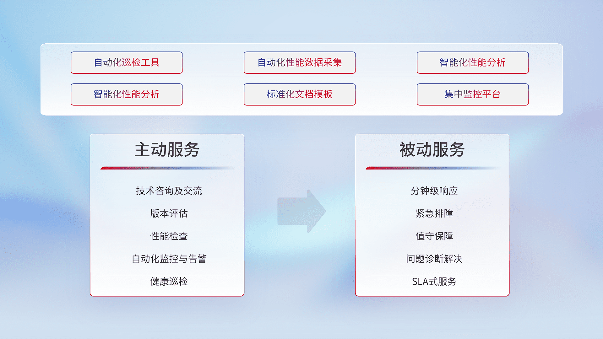 智能化工具和标准化文档,,,保障服务质量,,提供主动服务(包含技术咨询、、、、版本评估、、、、性能检查、、、、自动化监控与告警、、、、健康巡检)和被动服务包含(分钟级响应、、、、紧急排障、、、、值守保障、、问题诊断解决、、SLA服务)。。。。